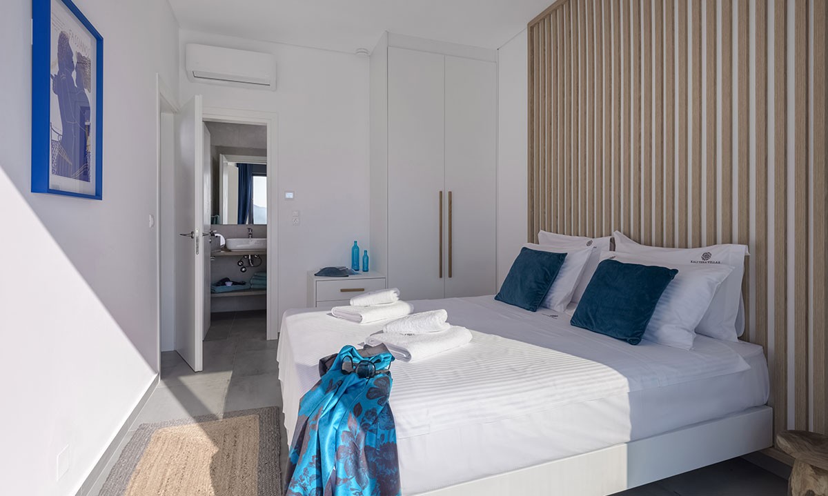 Sustainably designed in a modern, minimalistic style each villa can sleep up to six guests on a total of 160m² floor space. The interior has been furnished and fitted to a very high standard. The incredible views out across the private infinity pool and Hersonissos Bay can be admired through the full-length windows, which appear throughout the building. Lovingly integrating locally designed and manufactured furniture with modern amenities create a wonderful luxurious atmosphere