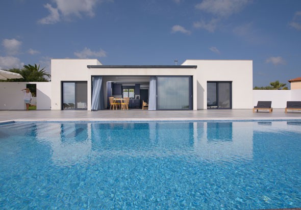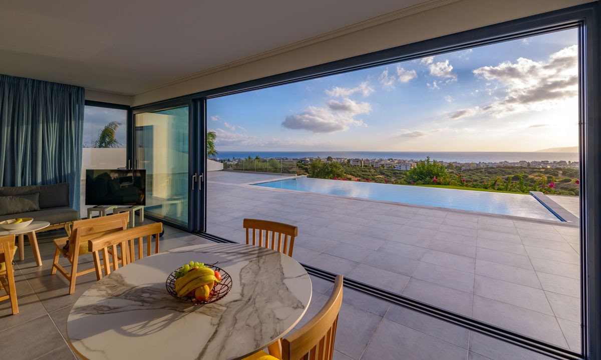 Each luxury self-catering villa enjoys a private infinity edge pool (ca. 9x3m), a private 200m² terrace with sun loungers by the pool, outdoor kitchen appliances and large dining table – ideal for al-fresco dining under a shady patio overlooking the entire Hersonissos Bay and Selena Mountain ridge. A small private garden and lawn is available for playing and sunbathing.